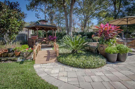 علاوه بر آلاچیق طراحی فضای سبز نیز می تواند زیبایی منظره را چندین برابر کند. طراحی یک پل چوبی در میان مسیر سنگ فرش که به ورودی آلاچیق منتهی می شود در کنار گیاهان و گلدان های رنگارنگ در عین سادگی زیبایی باغ شما را افزایش خواهند داد.